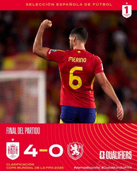 这场比赛充分体现了西班牙的整体实力与控制力,西班牙不仅在控球率、射门次数、传球成功率等方面全面压制对手,也展现了极高的比赛专注度。球队中场梅里诺成为最大亮点,他的两粒头球几乎复制粘贴般精准,这名中场也是继续展现自己出色的得分能力,成为西班牙进攻的关键球员,而佩德里的表现同样令人印象深刻,球员展现出西班牙中场的创造力。