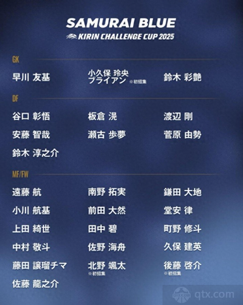 门将:铃木彩艳(帕尔马)、早川友基(鹿岛鹿角)、小久保玲央(圣图尔登)