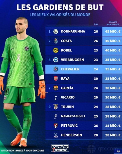 球天下12月16日讯 德国足球转会网在近期对球员身价数据进行更新与调整,德转方面也是发布了最新的门将身价排行榜单,在这份榜单中曼城门将多纳鲁马身价最高,排名榜首的位置,波尔图门将科斯塔以及多特蒙德门将科贝尔并列排名第二名的位置,巴黎圣日耳曼门将舍瓦利耶以及阿森纳门将拉亚排名第三名,另外霍安加西亚、维卡里奥等多名门将也在榜单上。