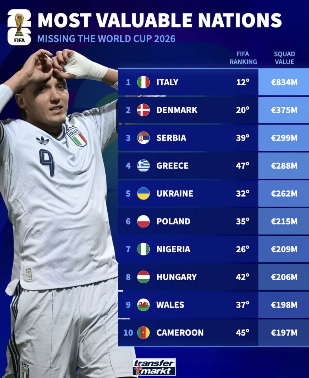 球天下4月2日讯 随着世界杯48强正式出炉,德国转会市场即时统计了缺席本届世界杯的球队身价榜。意大利以8.34亿欧高居榜首,丹麦和塞尔维亚分别以3.75亿和2.99亿排名二三位。