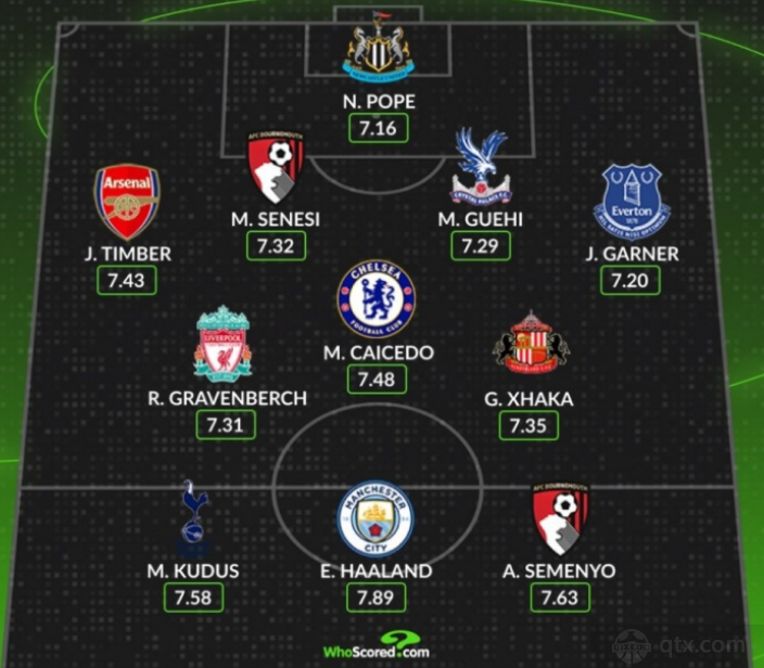 前锋:库杜斯(热刺)、哈兰德(曼城)、塞门约(伯恩茅斯)