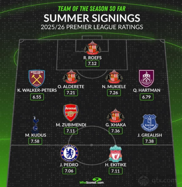 WhoScored评新赛季英超新援最佳阵容 枪手中场在列