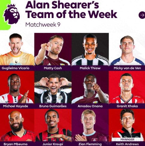 球天下10月28日讯 在英超联赛第9轮比赛结束之后,英超官方发布了希勒评选的本轮英超最佳阵容,在这份阵容中阿斯顿维拉、热刺以及纽卡斯尔联入选球员最多,各有2名球员入选,曼联、伯恩茅斯、布伦特福德、伯恩利以及桑德兰也有球员在列。在这份阵容中,有多名球员参与进球帮助球队取胜,比如曼联前锋姆贝乌莫、纽卡斯尔联中场吉马良斯、热刺后卫范德文以及阿斯顿维拉后卫卡什,这几名球员都在本轮帮助球队获得关键胜利。