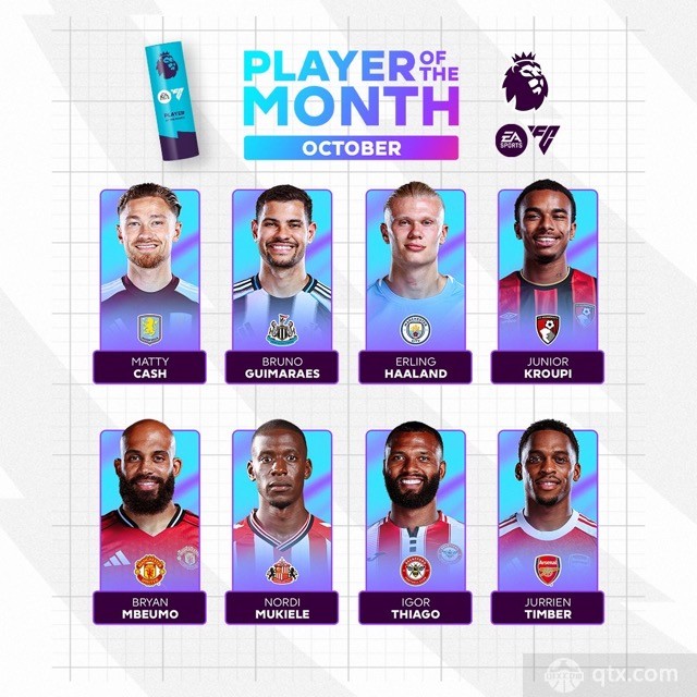 北京时间10月30日,英超官方公布了10月最佳球员候选名单,入选的8名球员分别是卡什、吉马良斯、哈兰德、克鲁皮、姆伯莫、穆杰莱、伊戈尔-蒂亚戈和廷贝尔。
