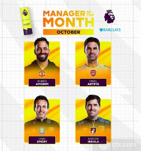 球天下10月31日讯 英超联赛官方发布了10月最佳主帅的候选名单,在这份名单中包括了阿森纳主帅阿尔特塔、曼联主帅阿莫林、阿斯顿维拉主帅埃梅里以及伯恩茅斯主帅伊劳拉。这几名主帅都带领球队在10月份的英超联赛取得出色的战绩,预计英超官方将会在近期公布联赛10月最佳主帅获奖者。