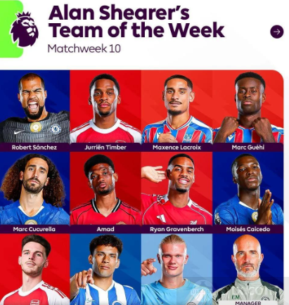 球天下11月6日讯 英超官方公布了希勒评选的联赛第10轮最佳阵容,在这份阵容中切尔西有3名球员入选,阿森纳与水晶宫各有2名球员入选,曼城、布莱顿、曼联以及利物浦各有一名球员入选。其中,本轮比赛表现比较吸引关注的是曼城前锋哈兰德、阿森纳中场赖斯以及切尔西中场凯塞多,这三名效力于豪门球队的球员都在本轮比赛用自己的出色表现帮助球队获得了胜利,展现出了他们的实力。