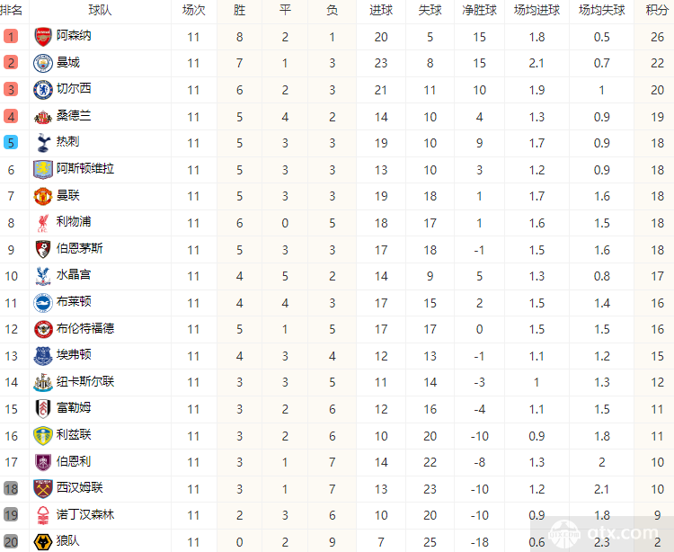 球天下11月10日讯 英超第11轮比赛已经结束全部交锋,在本轮比赛中多支豪门的境遇不同,其中曼城与切尔西获得了比赛的胜利,阿森纳、曼联与热刺获得平局,而利物浦则是输掉了比赛。在本轮比赛过后积分榜的排名也有一些变化,其中阿森纳继续排名榜首,曼城上升至第2名的位置,球队与榜首的分差缩小,切尔西、热刺以及曼联也是保持在前几名,而利物浦的排名则是继续下降,球队仅仅排名联赛中游的位置。