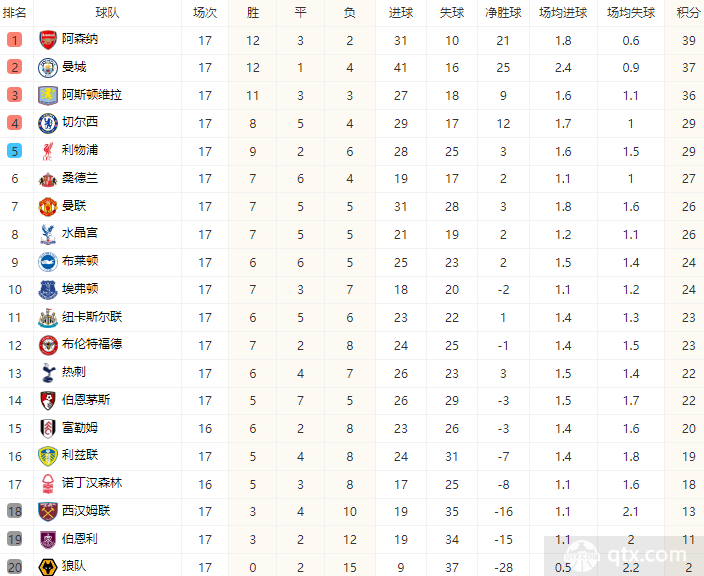 球天下12月22日讯 英超联赛第17轮比赛已经结束了大部分比赛的交锋,在本轮比赛中多支争冠球队以及排名中上游的球队继续进行激战,其中排名联赛前三名的阿森纳、曼城以及阿斯顿维拉都获得了胜利,而排名联赛上游的利物浦也是在与热刺的关键战赢球,切尔西在本轮比赛战平,曼联输掉了比赛,目前阿森纳继续排名英超联赛榜首的位置,曼城与阿斯顿维拉继续紧追榜首。