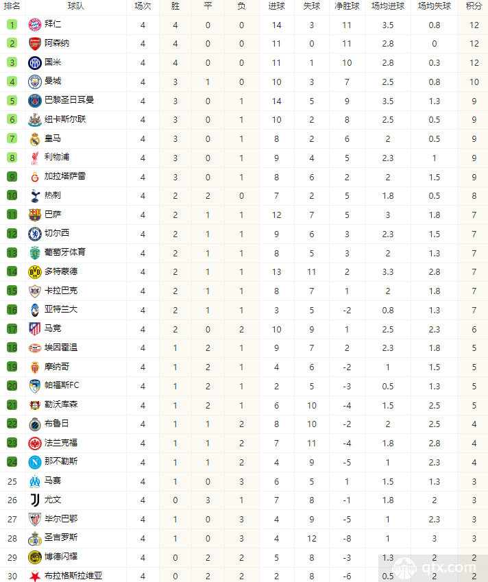 欧冠积分榜 拜仁阿森纳国米三队同分排名前三
